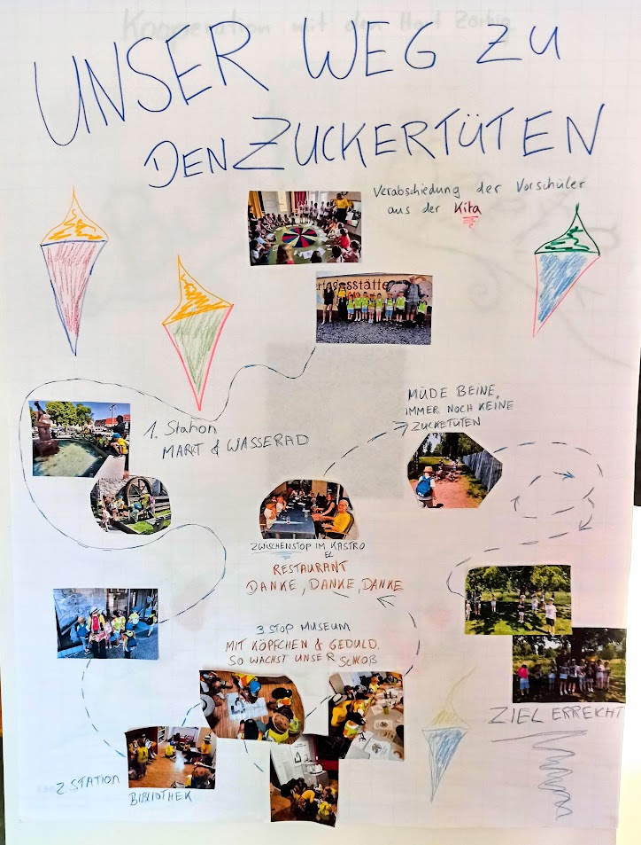 Trotz müder Beine und der immer noch fehlenden Zuckertüten gaben die Kinder nicht auf. Ihre Entschlossenheit zahlte sich schließlich aus: Am Ende des spannenden Tages wurden die Zuckertüten gefunden!